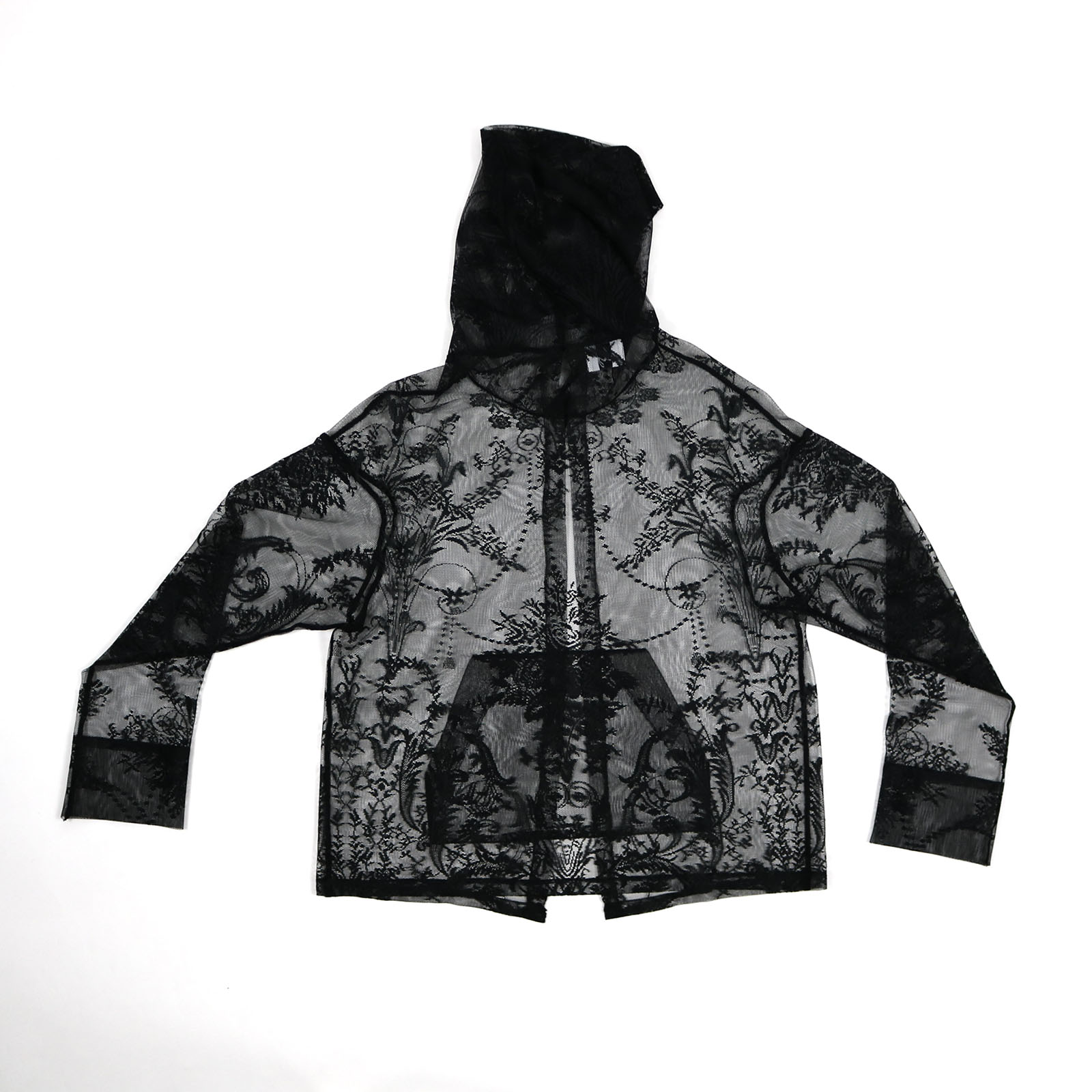 Constructed in a reclaimed lace, this hoodie is loose-fitting with long drop-sleeves, an open back, a kangaroo pocket and hood.
