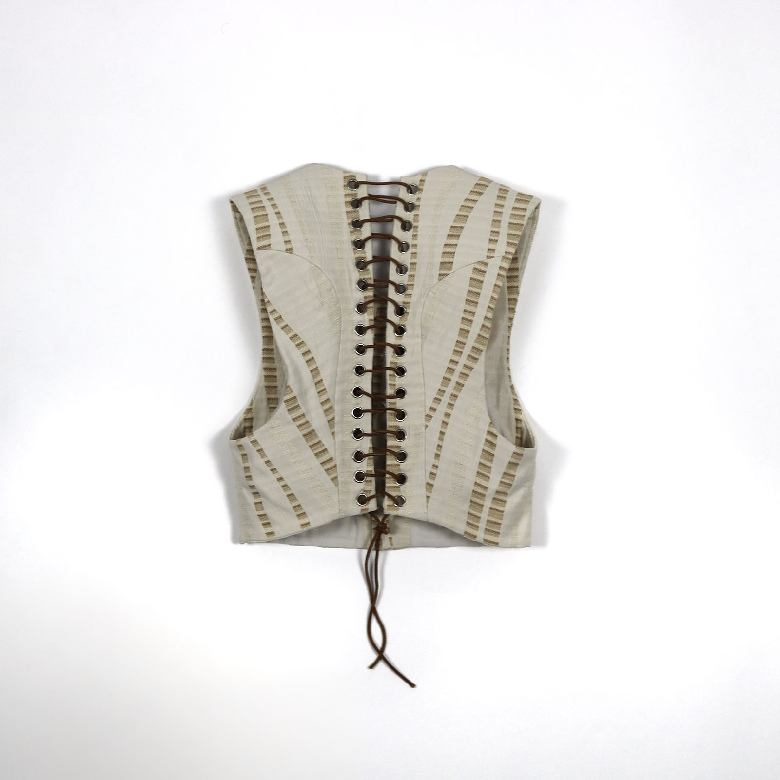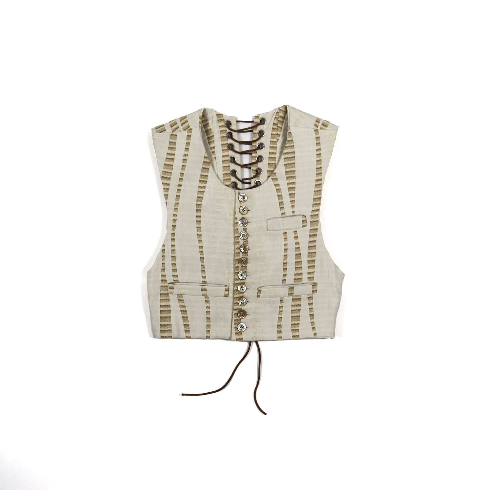 Constructed in a vintage upholstery, the tailored waistcoat features a welt pocket on each of the front pieces, a welt pocket on the left-side chest, an inside pocket on the right-side front, a lace-up back fitted with stainless steel 10mm eyelets and laced together with 3mm round natural leather cord, complete with vintage 1980’s Mother of Pearl buttons.