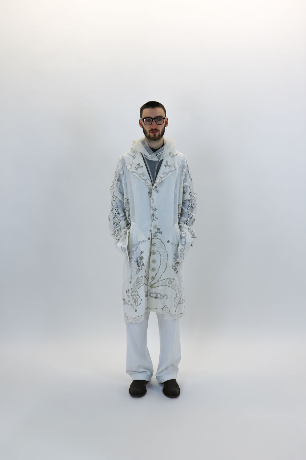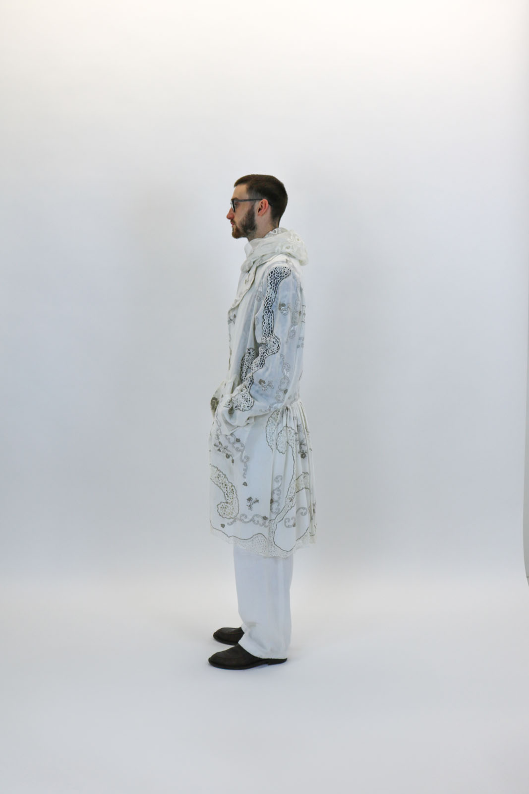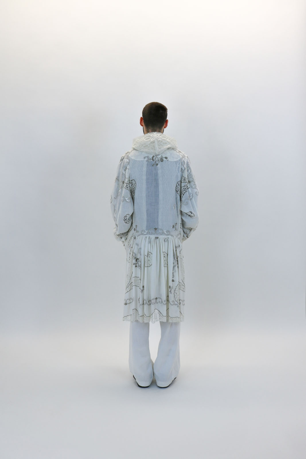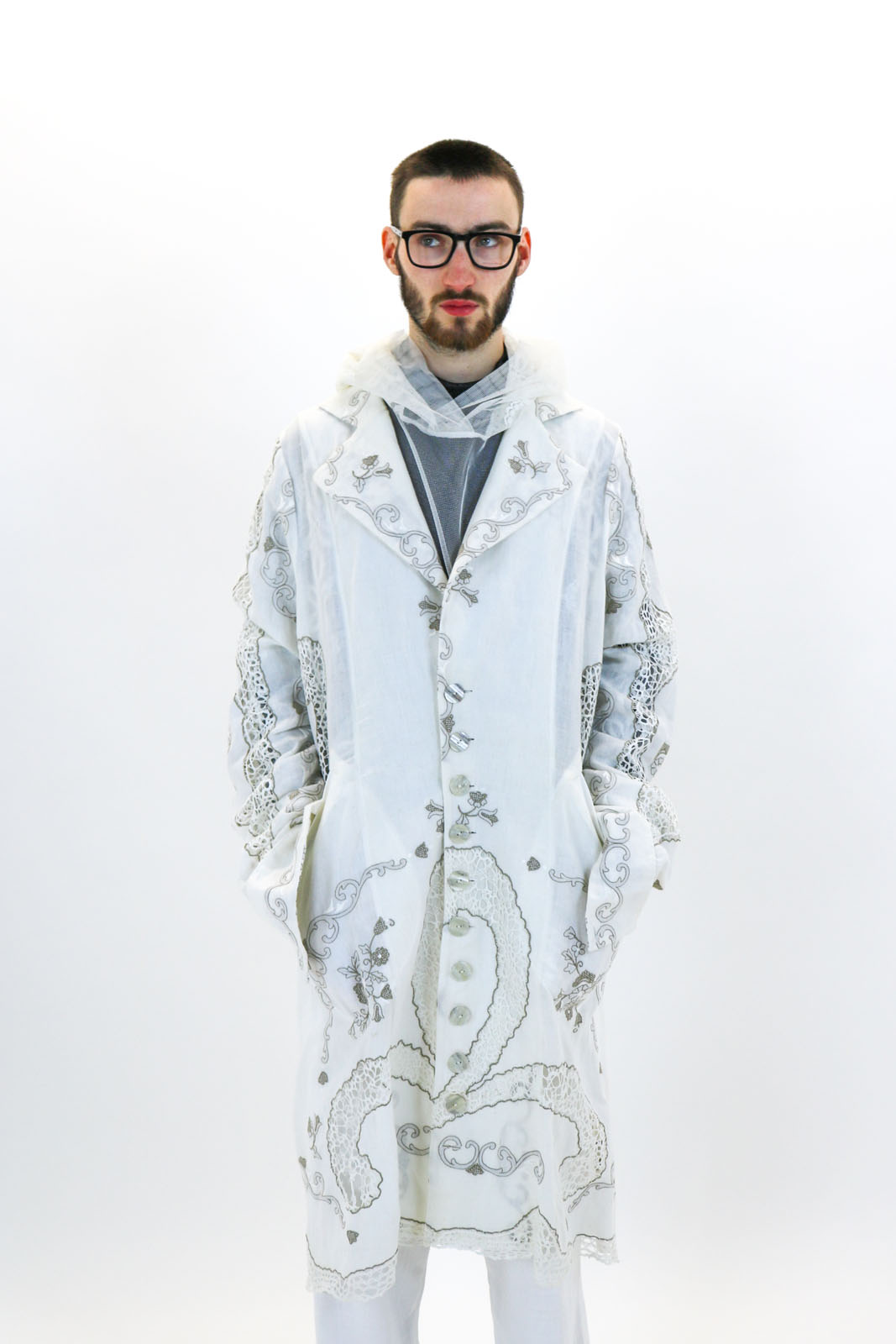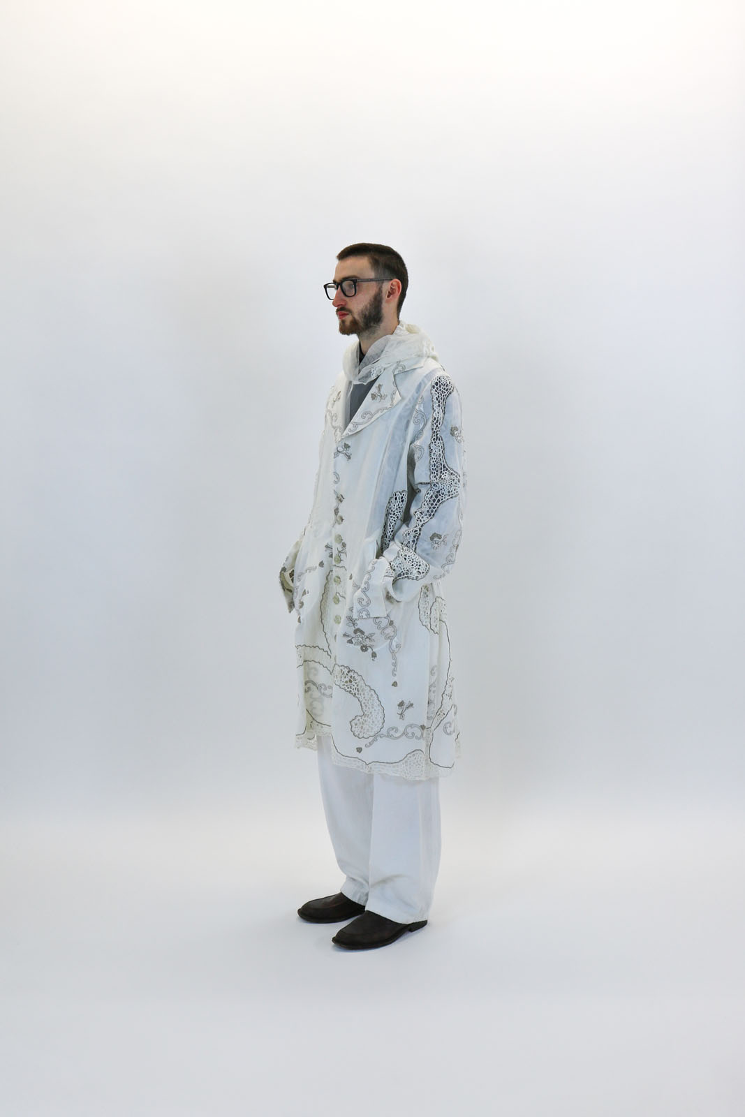 Constructed in an antique linen with hand-sewn lace detailing, this single breasted, full length, button-down oversized coat is fit with welt pockets at the waist on each side-front, a two-piece sleeve with cuff, notched collar, and a gathered back panel from the waist down. The coat is French seamed and bias-bound throughout and is not lined as it is intended as a summer coat. The coat is complete with Mother of Pearl buttons
