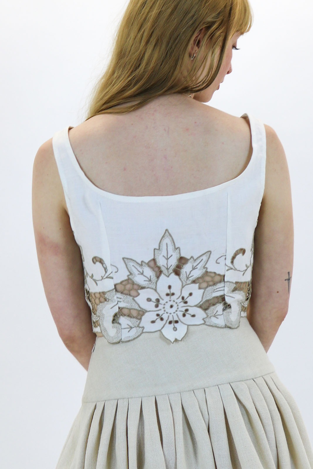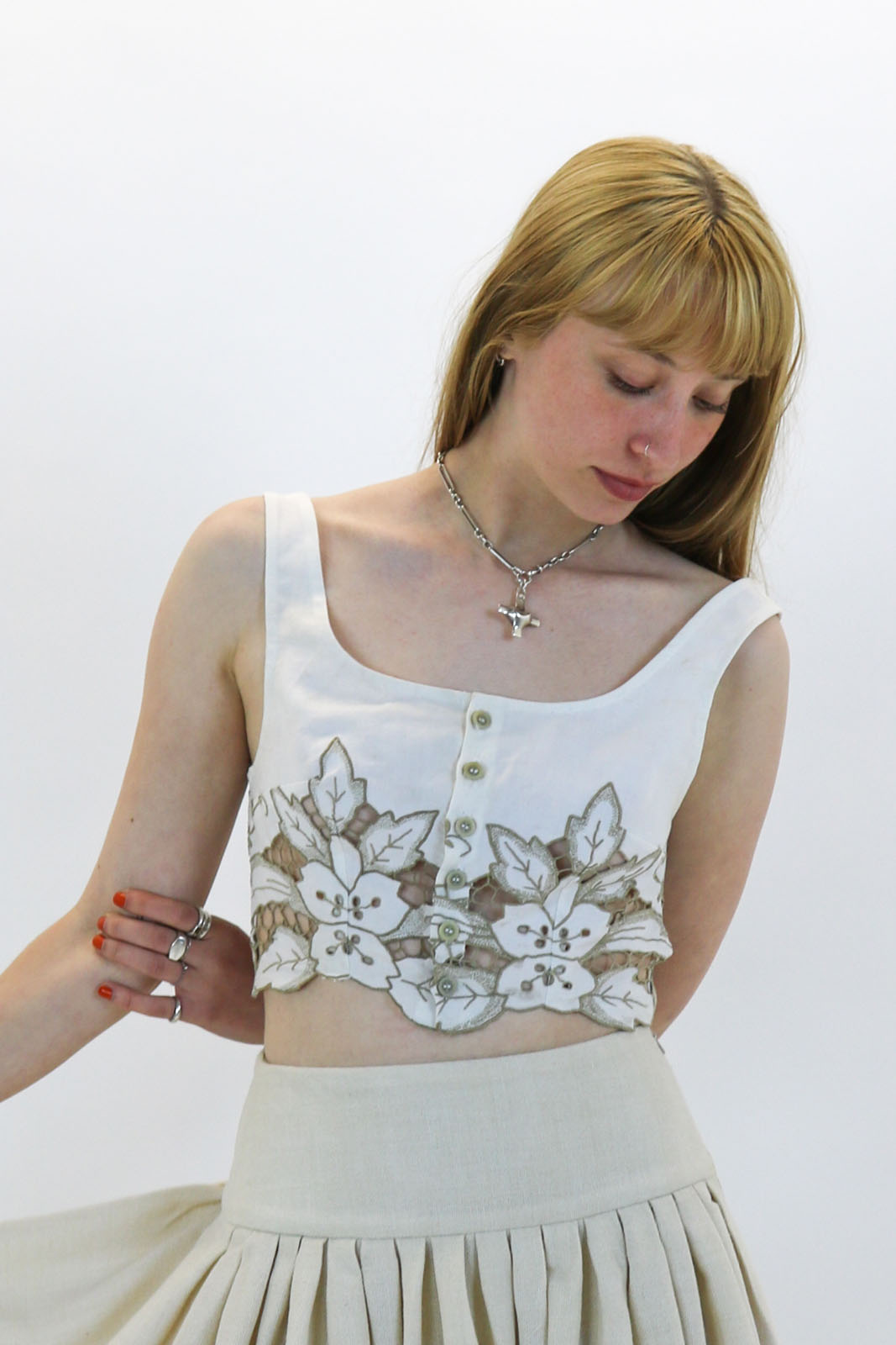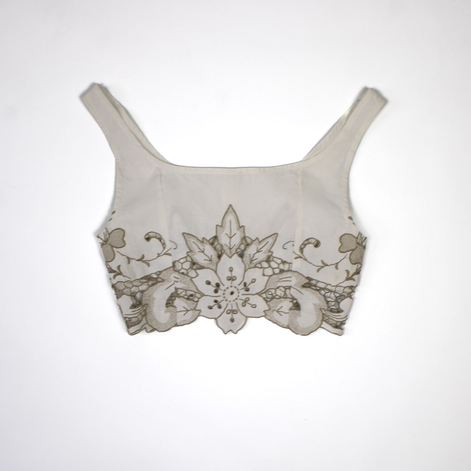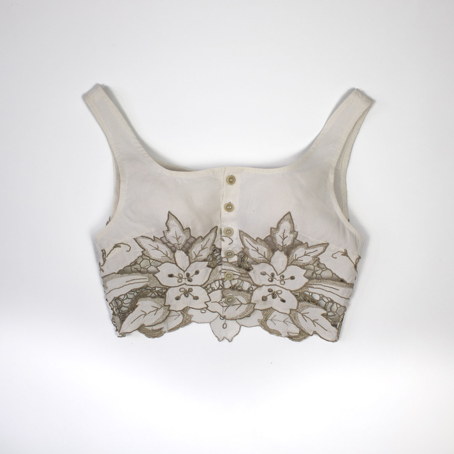 Constructed in antique linen with a scalloped edge, this fitted top features shoulder straps, a low neck and button down front.